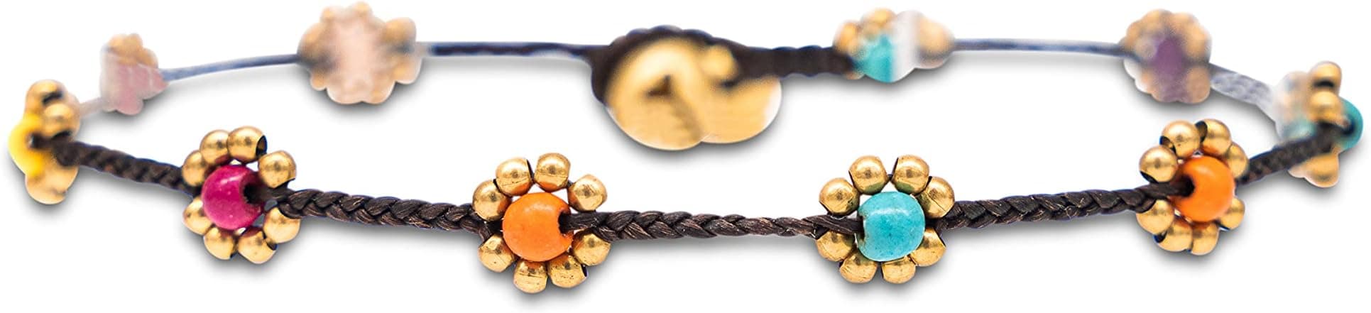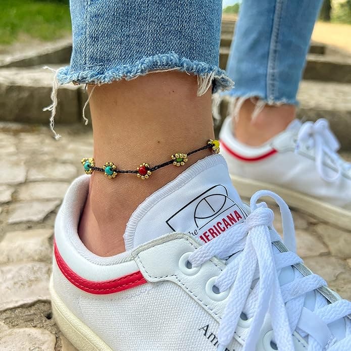 Bring Sommerfeeling an dein Fußgelenk mit unserem handgefertigten Boho Fußkettchen von Made by Nami. 🌸 Dieses farbenfrohe Surfer Anklet besteht aus gewachster Baumwolle und kleinen, goldfarbenen Messingblumen mit bunten Perlen – perfekt für dein Festival-, Strand- oder Alltagsoutfit.
