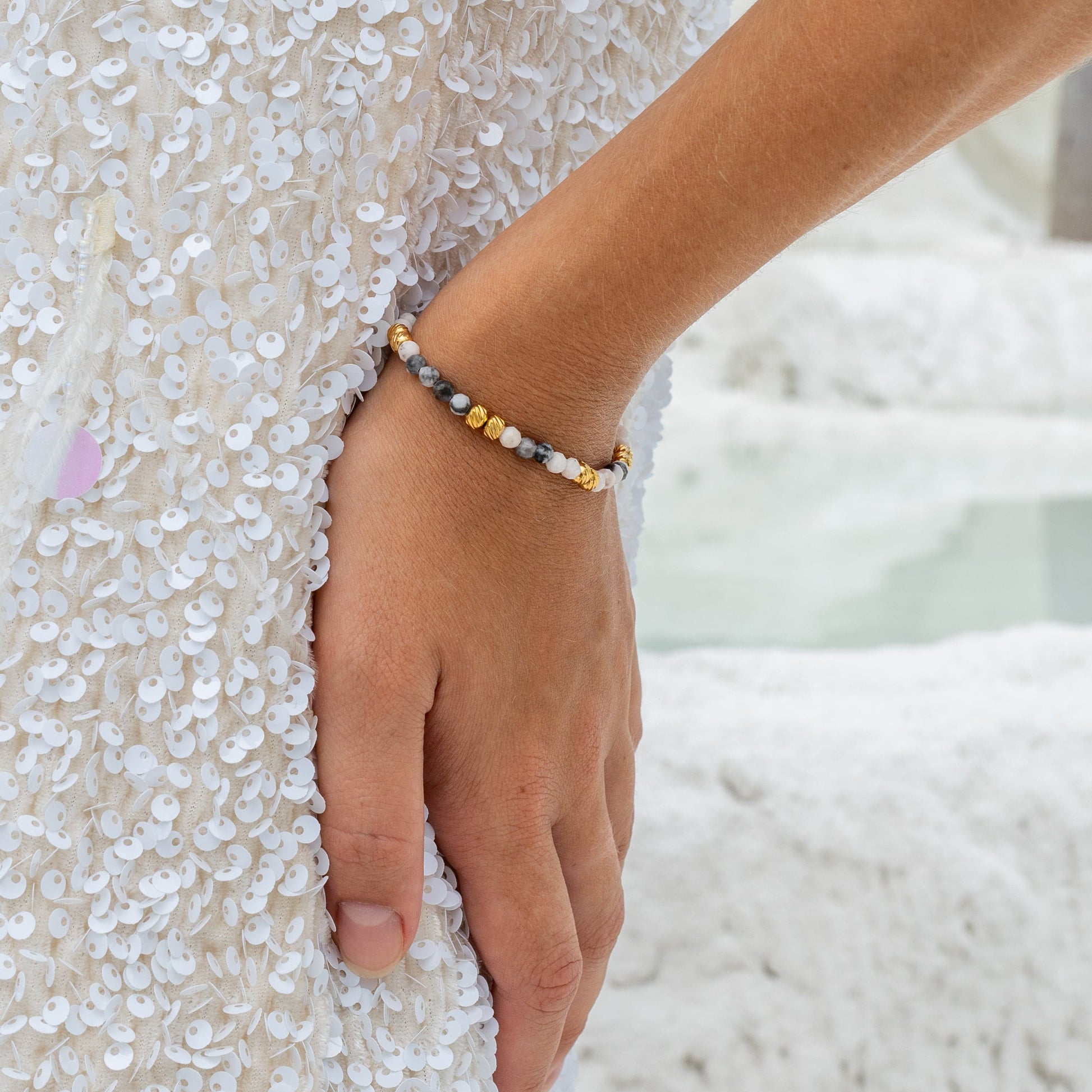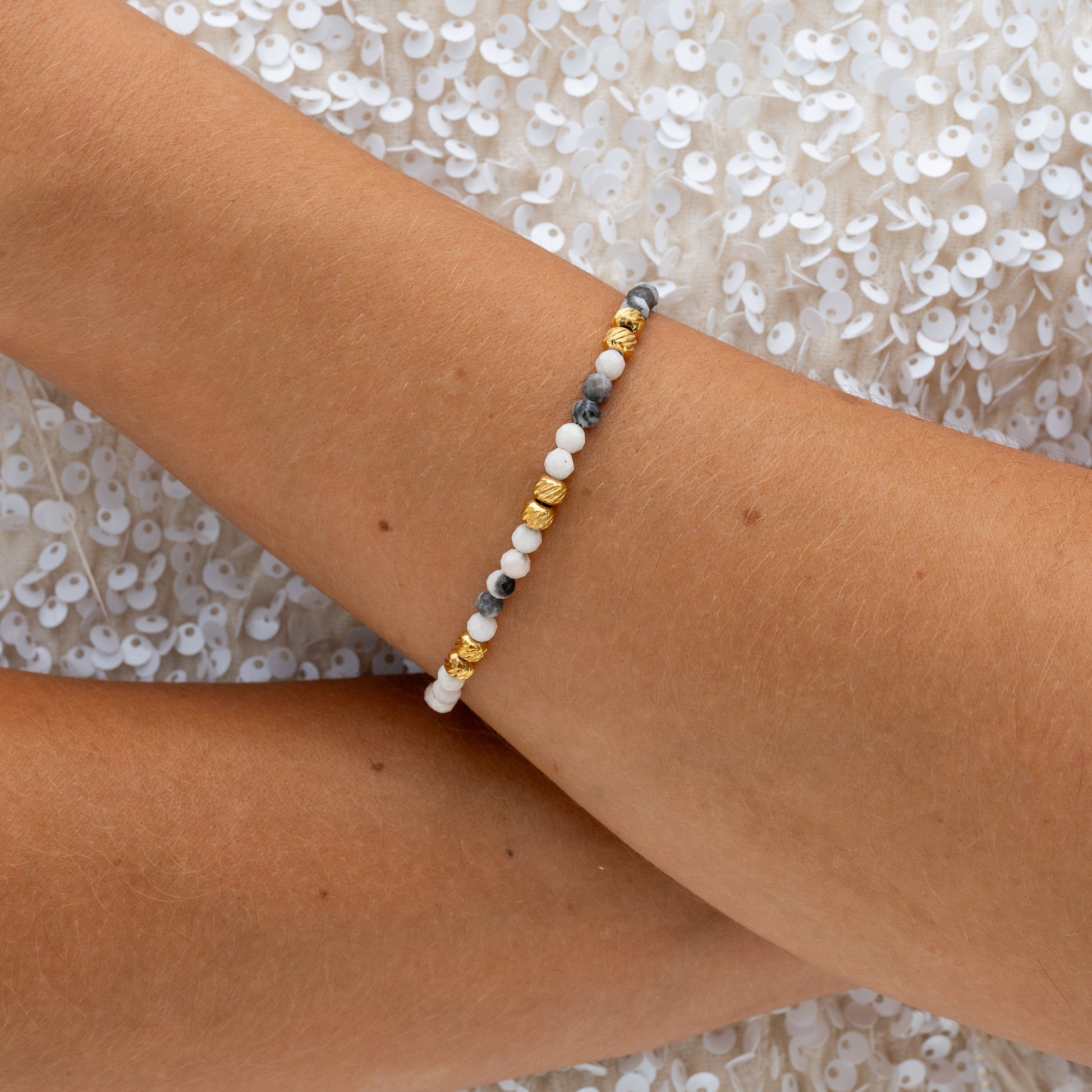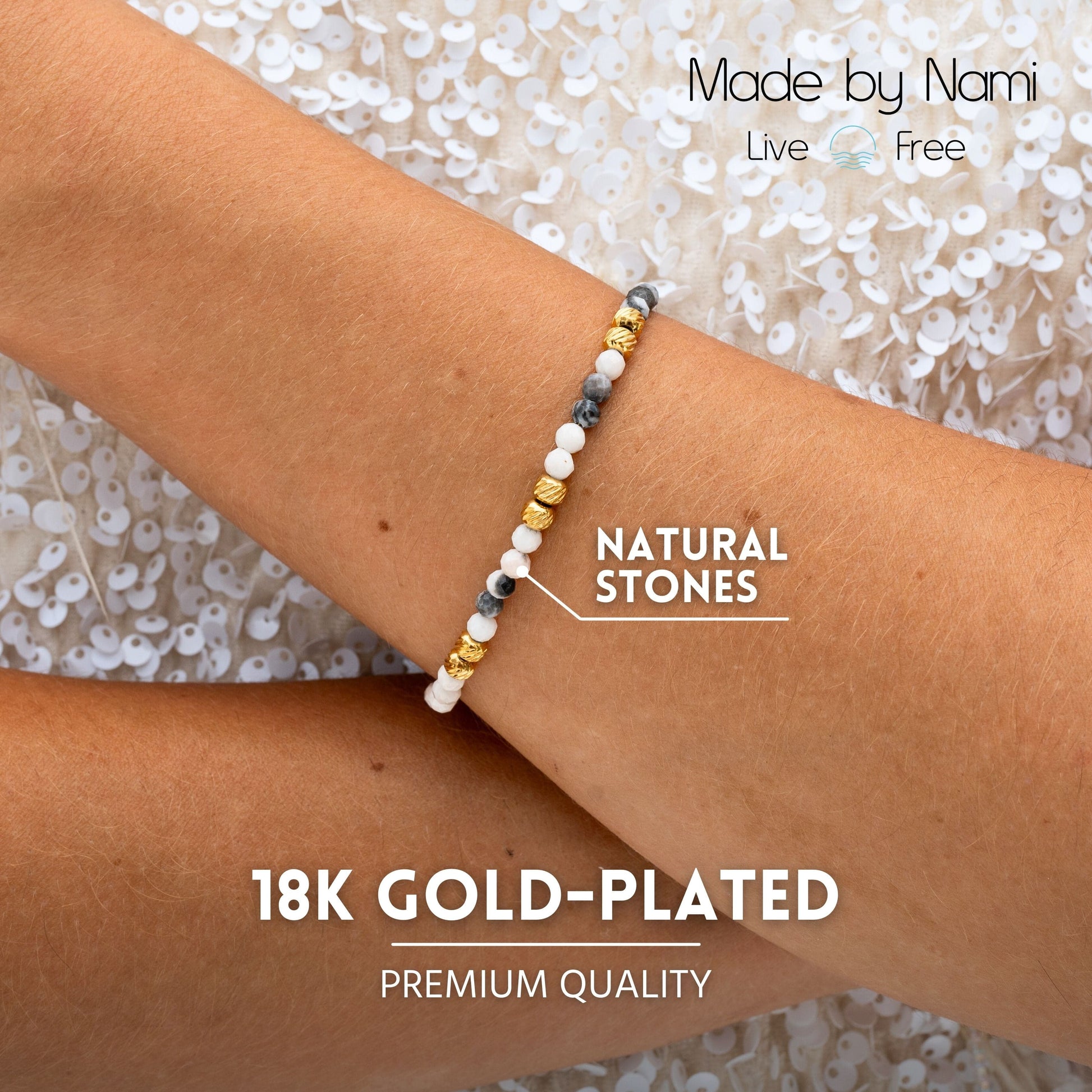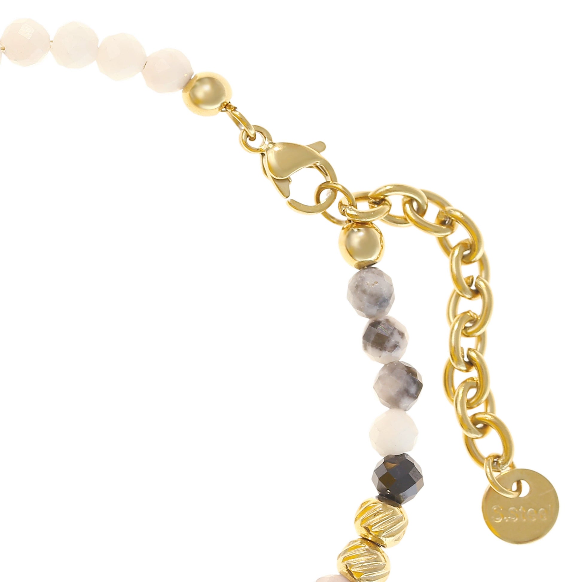 Unser elegantes Goldarmband mit Natursteinen vereint Stil und Leichtigkeit in einem feinen Boho-Design. Die Kombination aus schimmernden Goldperlen und zarten Naturstein-Perlen sorgt für einen harmonischen Look, der zu jedem Outfit passt.