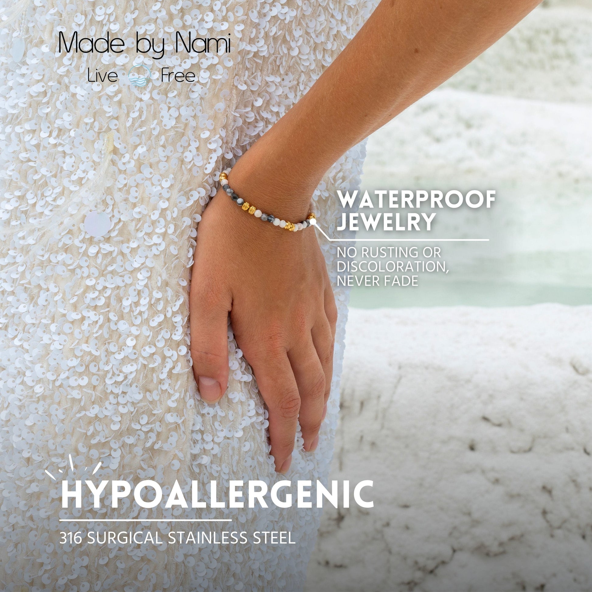 Hergestellt aus hochwertigem 316L Edelstahl und 18K vergoldet, ist das Armband hypoallergen, rostfrei und 100 % wasserdicht – perfekt für jeden Tag und jedes Abenteuer. Mit seinem leichten Tragekomfort (nur 6 g) und der verstellbaren Länge von 16 + 3 cm passt es sich jedem Handgelenk ideal an.