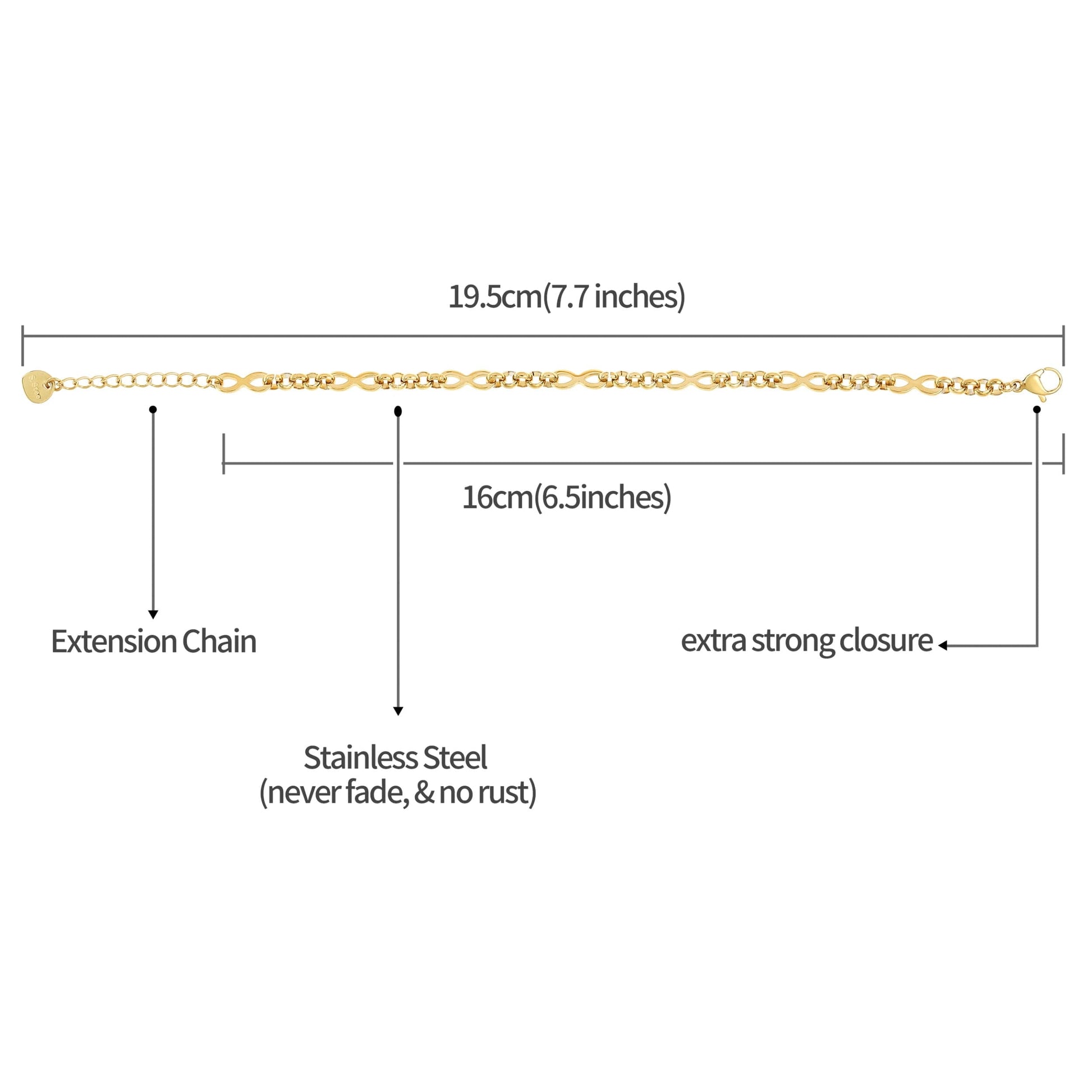 Das Armband ist 16 cm lang und lässt sich dank der 4 cm langen Verlängerungskette individuell anpassen. Der robuste Karabinerverschluss sorgt für sicheren Halt und angenehmen Tragekomfort.
