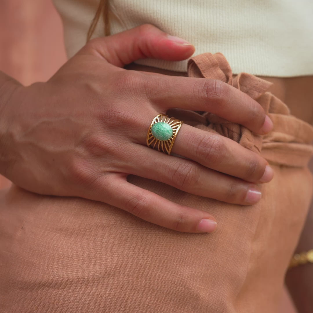 • Statement Goldring mit Edelstein » Dieser goldene Boho Damen Ring aus Edelstahl ist ein echtes Highlight und verkörpert Eleganz und Modernität. Perfekt für Dich, wenn Du Wert auf hochwertigen Goldschmuck legst.
