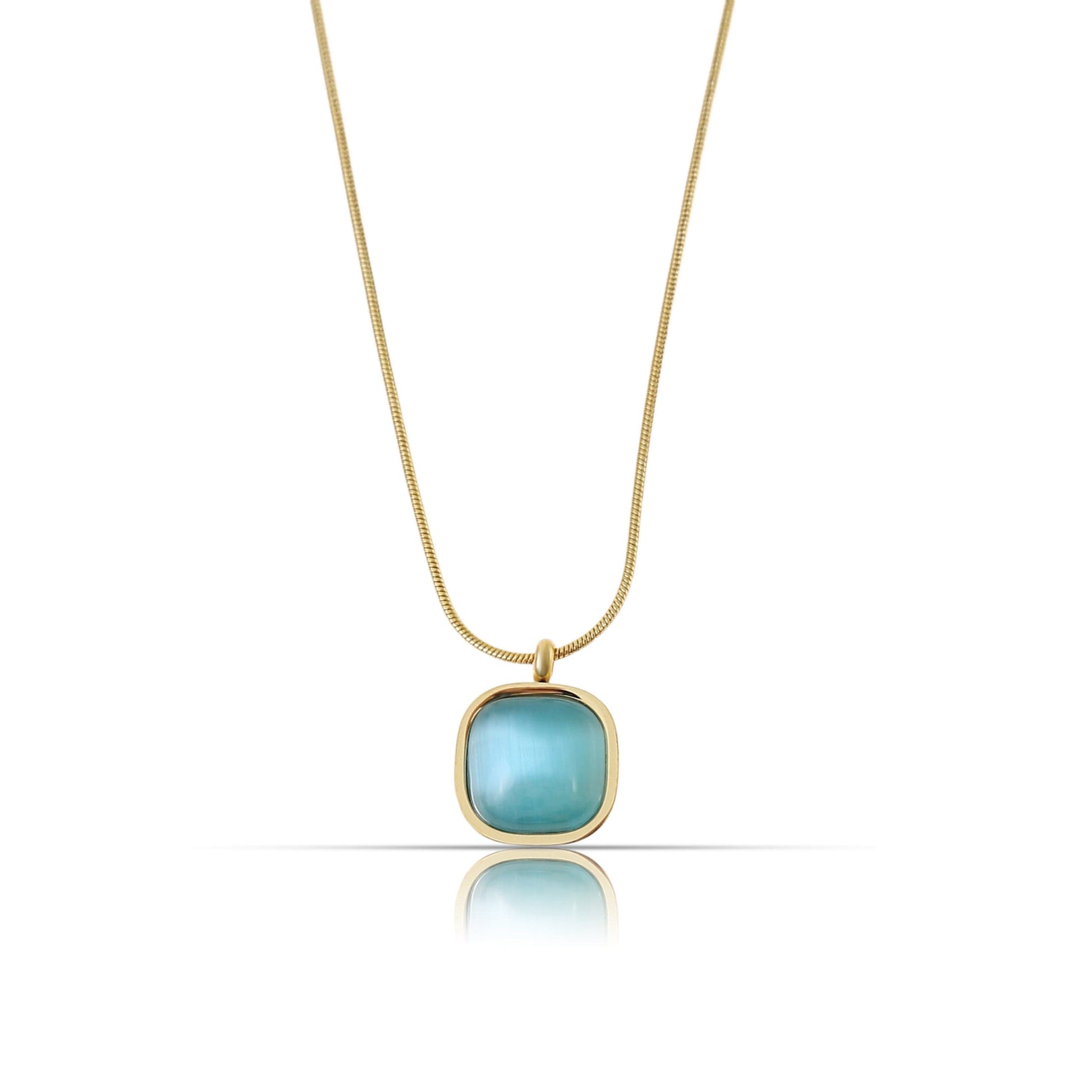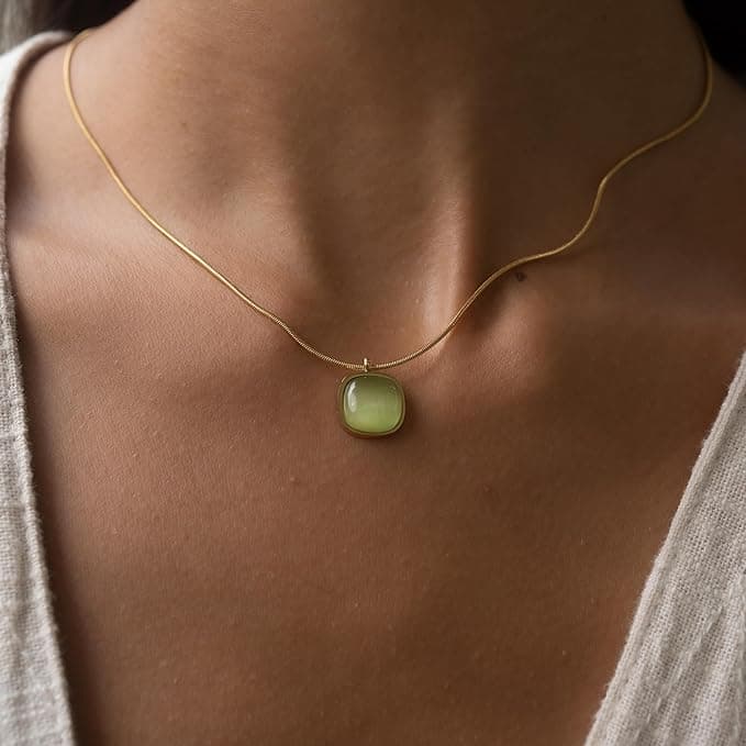 Made by Nami » Entdecke unsere elegante goldene Edelstein-Halskette – ein stilvolles Schmuckstück aus hochwertigem Edelstahl, veredelt mit einem feinen 18K Goldüberzug. Der quadratische Anhänger aus echtem Edelstein (wahlweise in Grün, Blau oder Rosa) verleiht jedem Outfit einen Hauch von Luxus und Natürlichkeit.