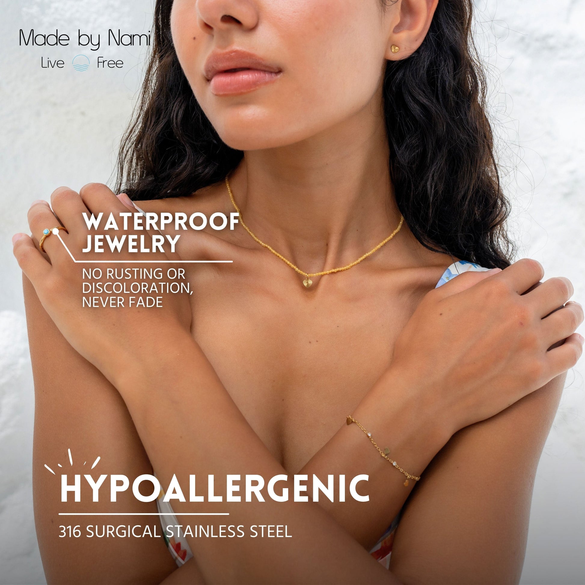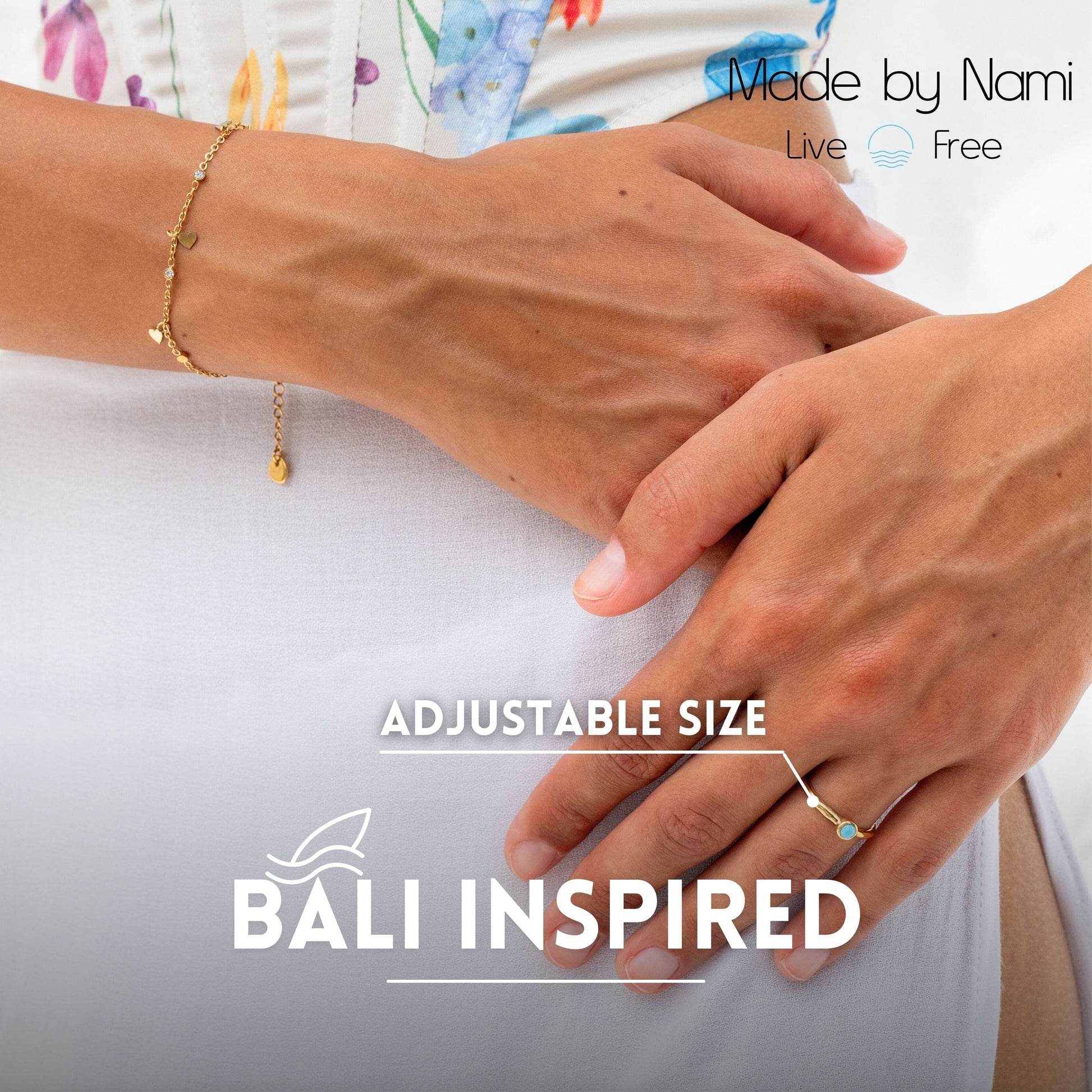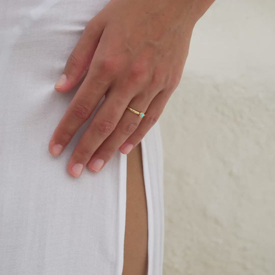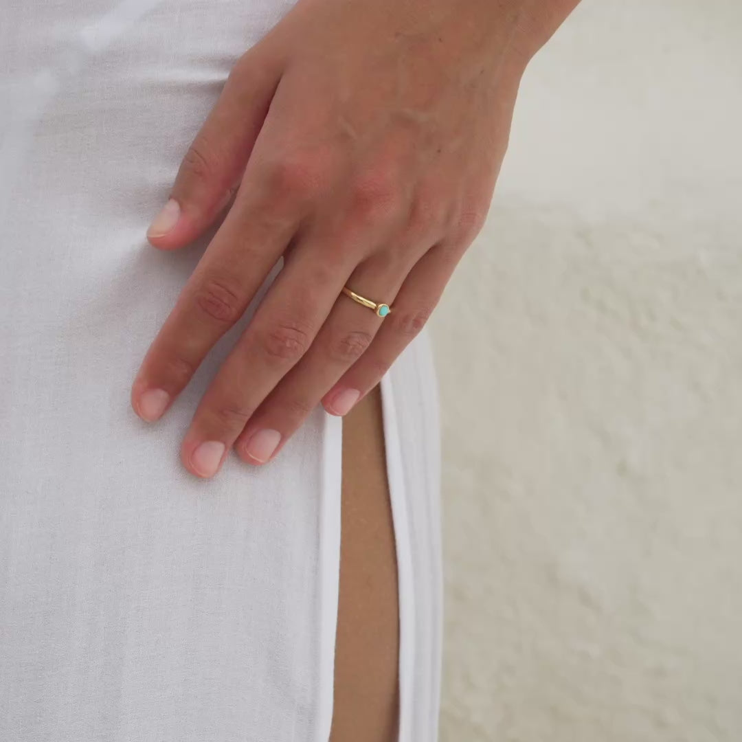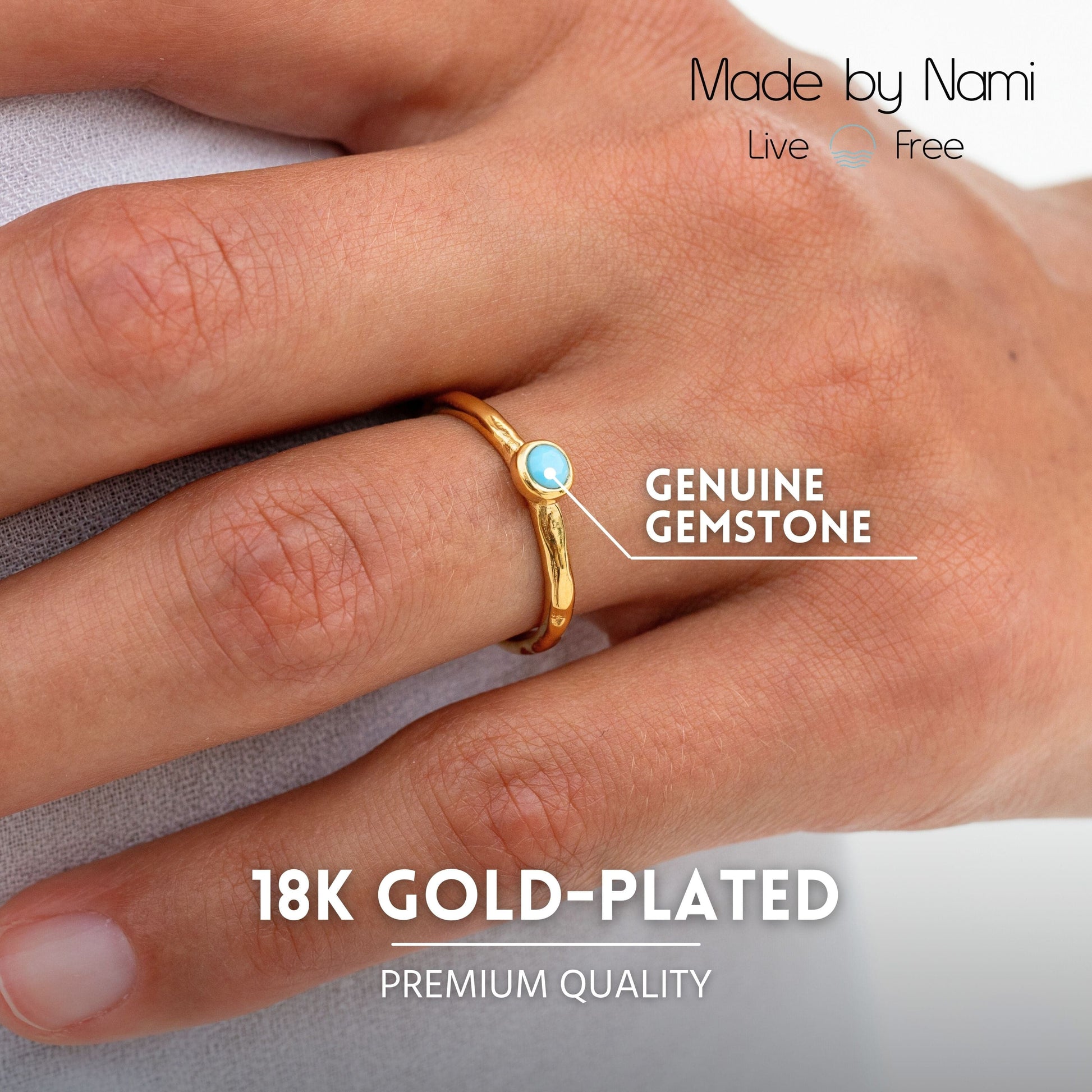 Verleihe deinem Look sommerliche Boho-Vibes mit unserem goldenen Ring mit echtem Türkisstein. Der feine, handgefertigte Ring aus 316L Edelstahl ist mit 18K Gold veredelt – hypoallergen, wasserfest und farbbeständig.